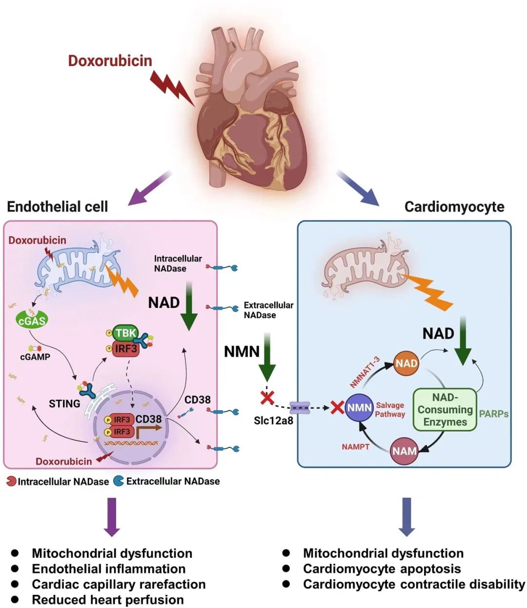 2023年5月8日,復旦大學附屬中山醫院葛均波院士與孫愛軍教授團隊在Circulation Research(IF=23.213)上發表題為"Critical Role of the cGAS-STING Pathway in Doxorubicin-Induced Cardiotoxicity"的研究論文,揭示了在DIC模型中,環狀鳥苷單磷酸腺苷單磷酸合酶-干擾素基因刺激因子(cGAS-STING)信號通路通過CD38擾亂心臟內皮細胞和心肌細胞的NAD穩態,NAD水平降低導致線粒體功能障礙,促進DIC的發生與進展。研究發現抑制該通路或可作為預防DIC的新手段,TBK1和CD38可能會是預防DIC且不干擾阿霉素抗腫瘤效率的重要靶點。